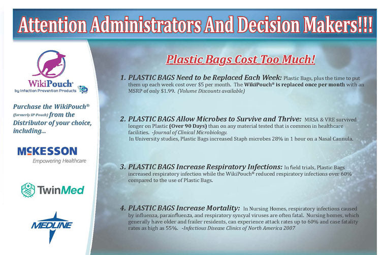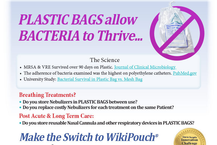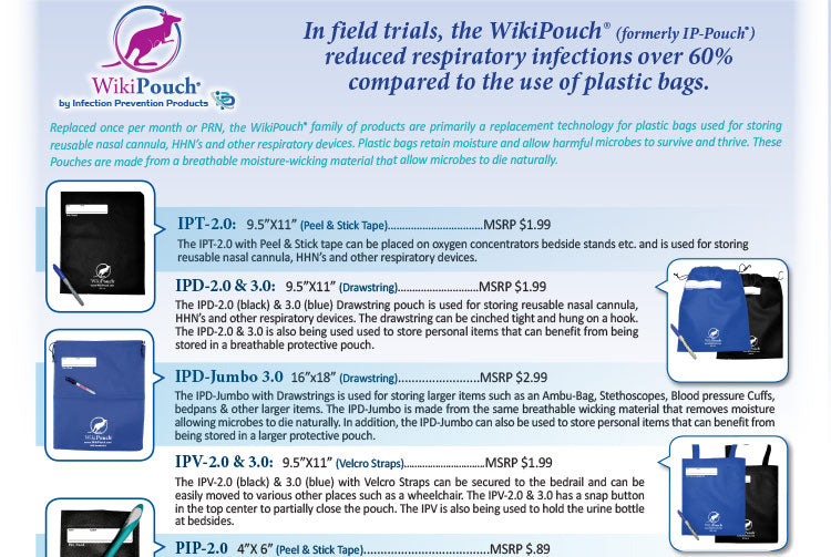 The WikiPouch® (formerly IP-Pouch) is a replacement technology for plastic bags used for storing reusable nasal cannula, HHN’s and other respiratory devices. The WikiPouch® is made from a breathable wicking material that removes moisture allowing the microbes to die naturally. Download and print our information sheets below.